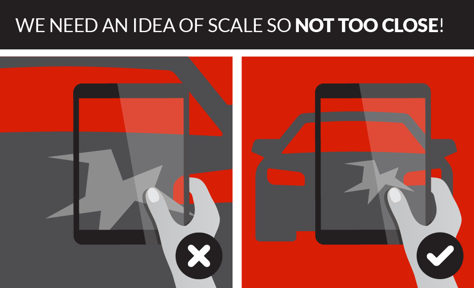 We need an idea of scale, so by standing back first, and then taking the shot you can easily show us where the damage on your vehicle is. Now go in for your close up!